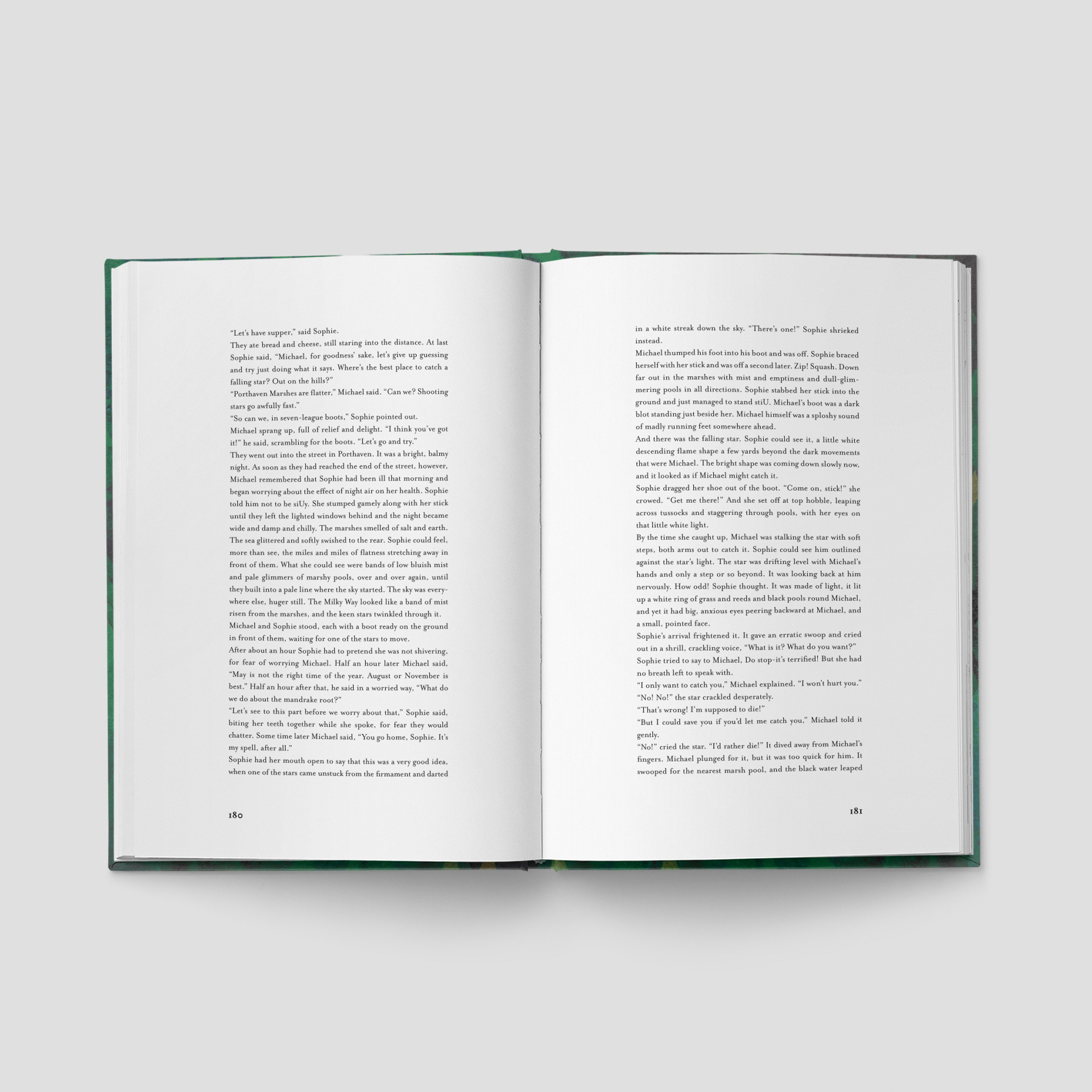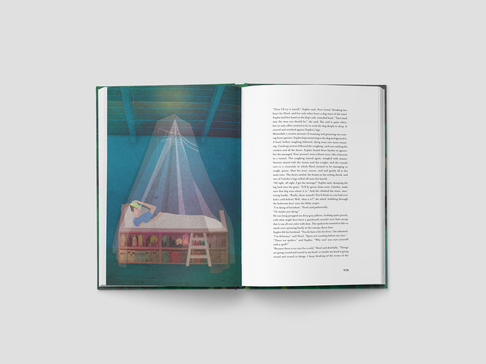 A competition project reimagines Howl’s Moving Castle through a visual approach that echoes its chaotic energy and shifting world. The cover sets the tone, capturing the tension between order and chaos: the castle emerges from a dense green forest while sweeping handwritten lettering cuts the scene. Inside, the tension continues—text layouts remain precise yet fluid, and dreamlike illustrations suggest rather than directly depict the story’s disorienting nature.